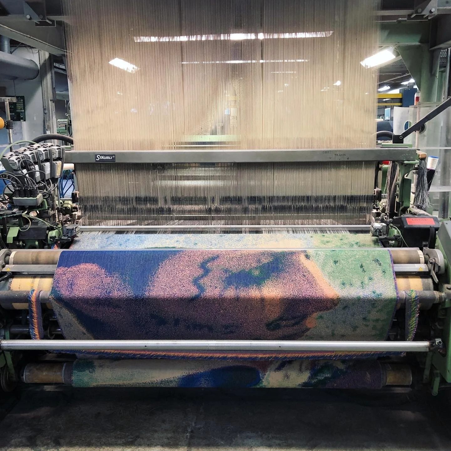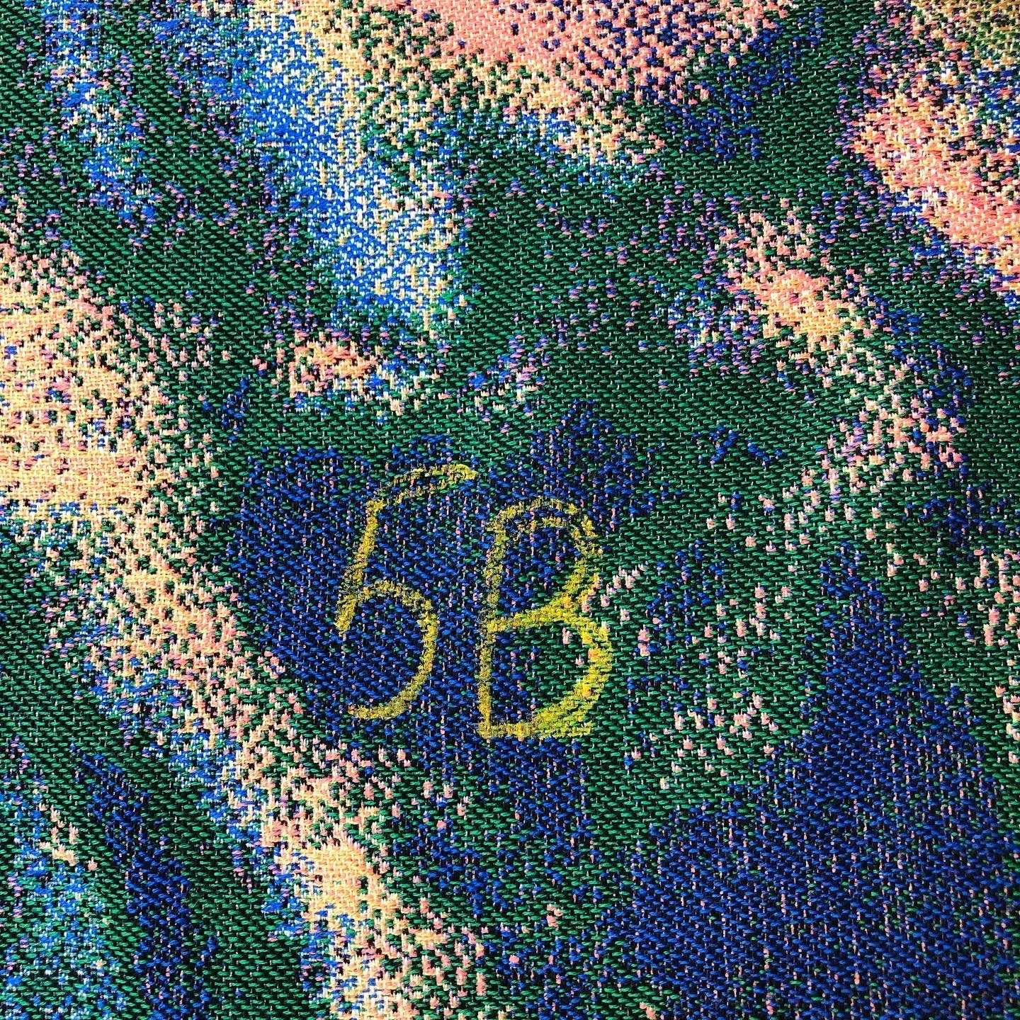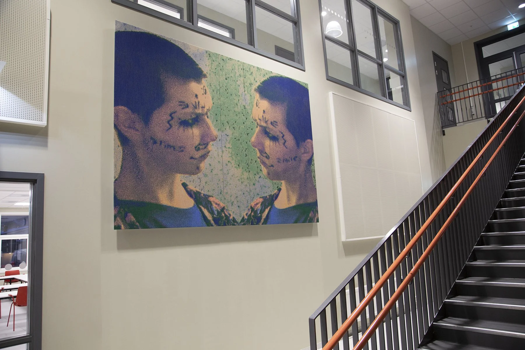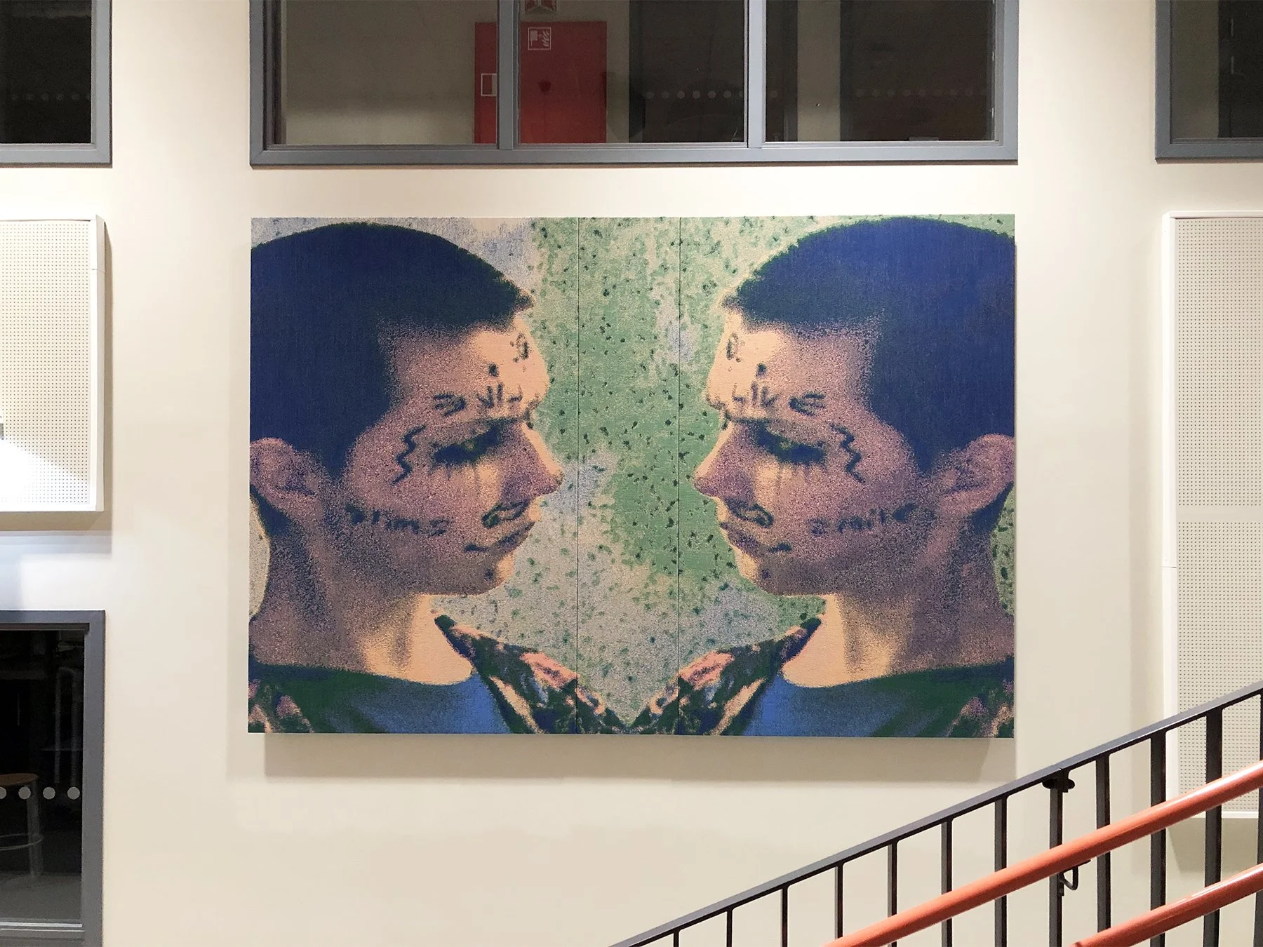 This is one of three works I made for Narvik School in 2021. “Twins” is a jacquard woven piece measuring 2,1x3m. The inspiration was a collection of selfies taken by my daughter that was 13 years old at the moment when images were taken. She painted her face in these tattoo-like brushes writing: “smile” and “live” on her cheeks. I made several sketches and worked on the composition and bindings of the colour fields. Technically, I had to take care of the wall's acoustic properties and find a clever way of joining the woven pieces together as the width of the woven surface was 1,5 for each panel. The artwork was installed in January 2022.