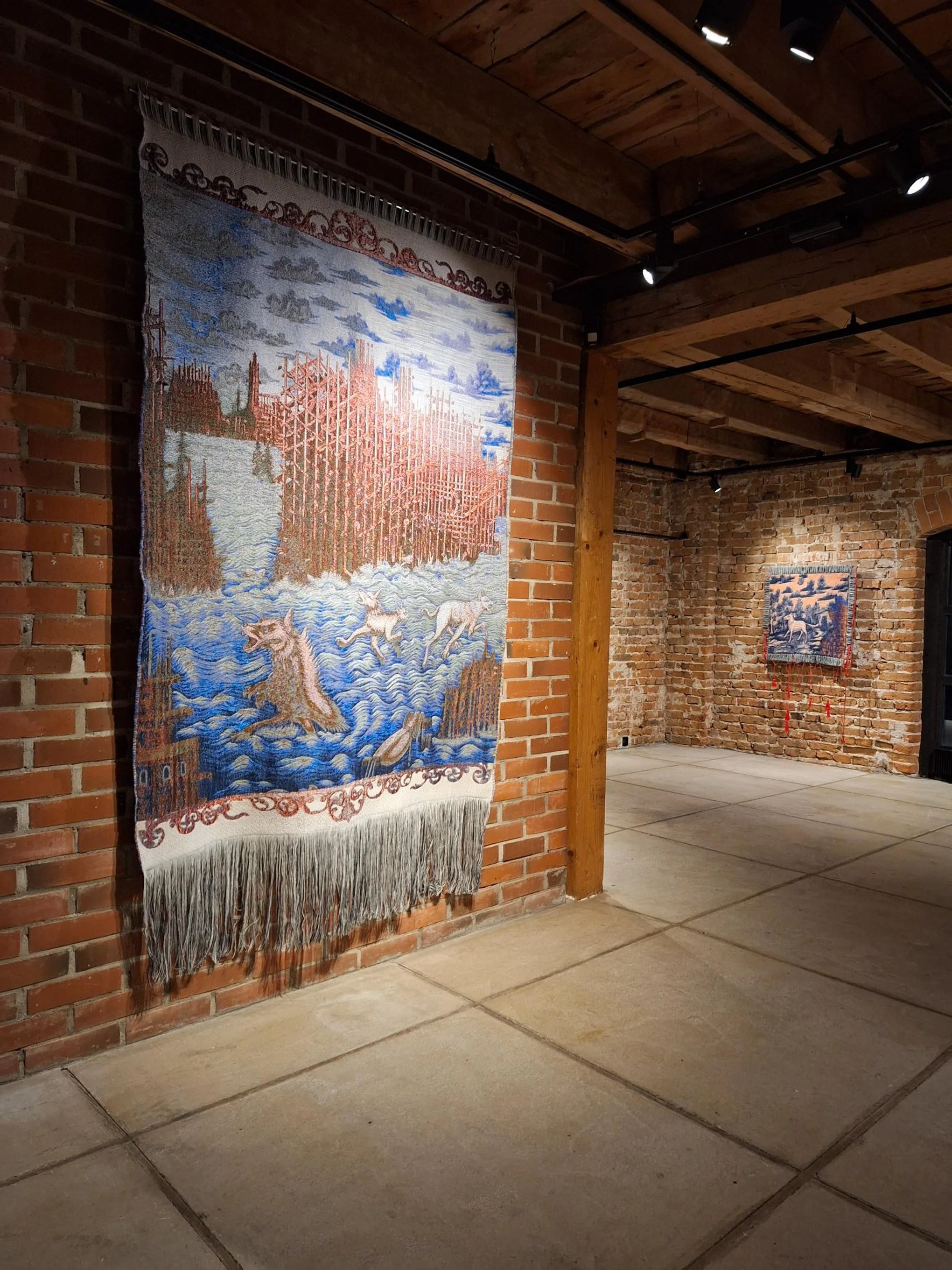 Bak trærne skimter du byen. De høye bygningene med tårn og spirer som vokser seg større og større for hver dag som går. De vokser ned mot vannet, ned mot havet hvor skyene bølger og dyrene danser. Epletrærne var der først, og nå flettes de røde båndene inn i bygningene, binder naturen sammen med det menneskeskapte som vevbindinger i fritt fall. Som arkitektoniske renningstråder.